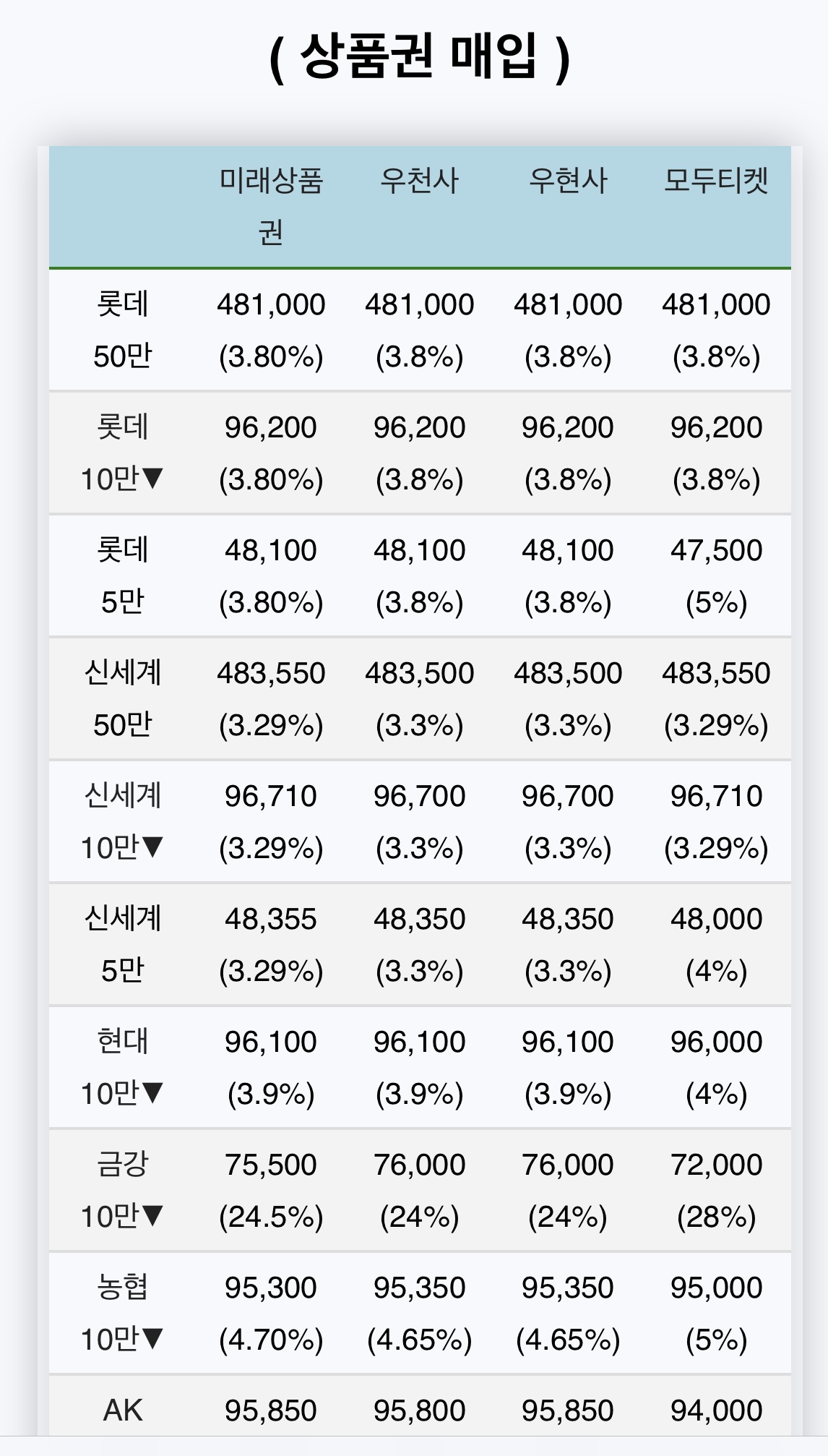 즉 개인이 상품권을 살 때의 시세가 나와있다.